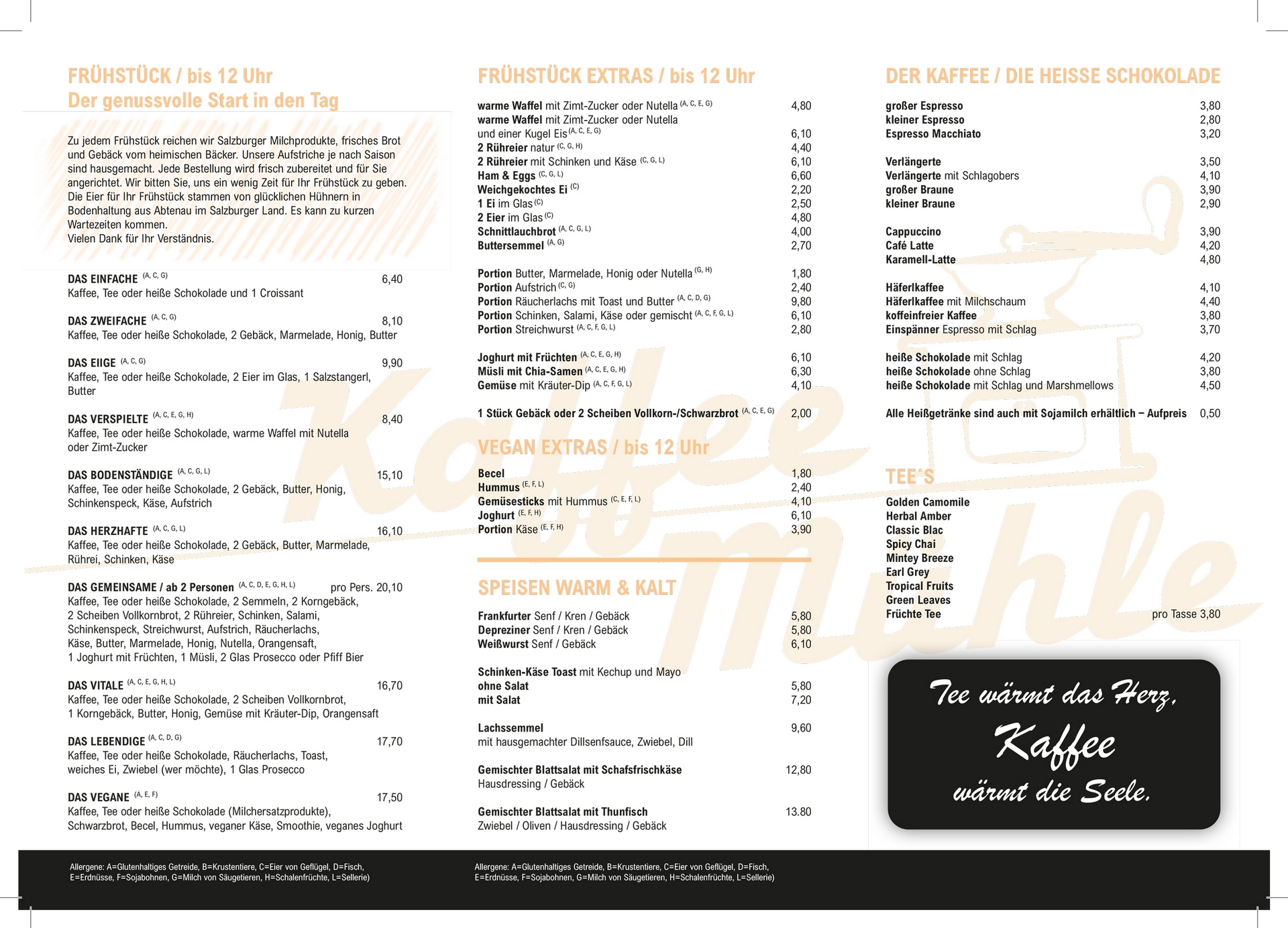 In unserem einzigartigen und gemütlichen Caféhaus in Niederalm, Anif bei Salzburg, erwartet Sie eine vielfältige Getränkekarte und hausgemachte Köstlichkeiten. Ob Sie nach einem perfekten Kaffee, handgemachten Kuchen und Torten oder einem herzhaften Tagesgericht suchen – bei uns sind Sie genau richtig.